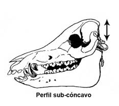 de la cabeza sub-cóncavo. Cara estrecha en su base, alargada y delgada. Caracteres